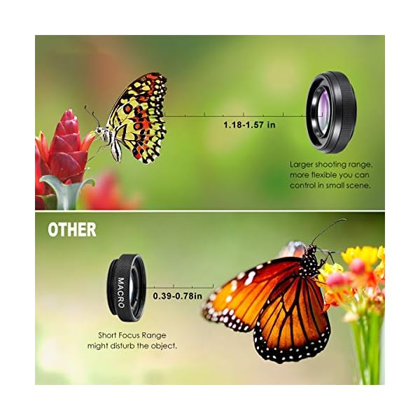 ◆ 15X Macro lens for extreme close-up shots, it means that you can take sharp pictures as close as 1.18-1.57 in from the subject, perfect for flowers, coins, insects, and so on.